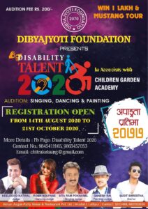 विश्व साईकल यात्री चित्र पौडेल यस कार्यक्रमको संयोजक तथा रश्मी शाक्य सह संयोजक हुनुहुन्छ । त्यसो त नेपालमा वर्षेनी प्रतिभा प्रस्तुत गर्ने थुप्रै कार्यक्रमहरु हुने गर्दछन्,तर शारिरीक रुपमा अशक्त फरक क्षमता भएका व्यक्तिहरु भने यस्ता कार्यक्रमहरुबाट टाढै रहेको महशुस गर्दे, शारिरीक रुपमा अशक्त फरक क्षमता भएका व्यक्तिहरुका लागि “डिसएवलिटी ट्यालेन्ट २०२०” आयोजना गर्ने लागेको कार्यक्रमको संयोजक चित्र पौडेलले बताउनुभयो ।