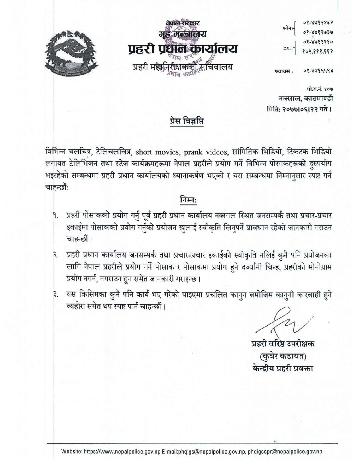 कार्यालयले विभिन्न चलचित्र, टेलिचलचित्र, साङ्गितीक श्रव्यदृष्य, टिकटकलगायत टेलिभिजन तथा स्टेज कार्यक्रममा नेपाल प्रहरीले प्रयोग गर्ने पोशाकको दुरुपयोग भइरहेकोतर्फ ध्यानाकर्षण भएको जनाएको छ ।
